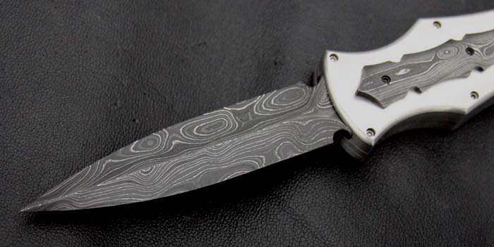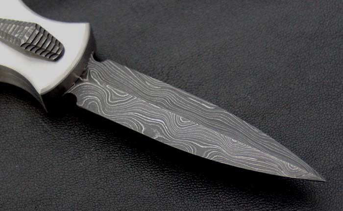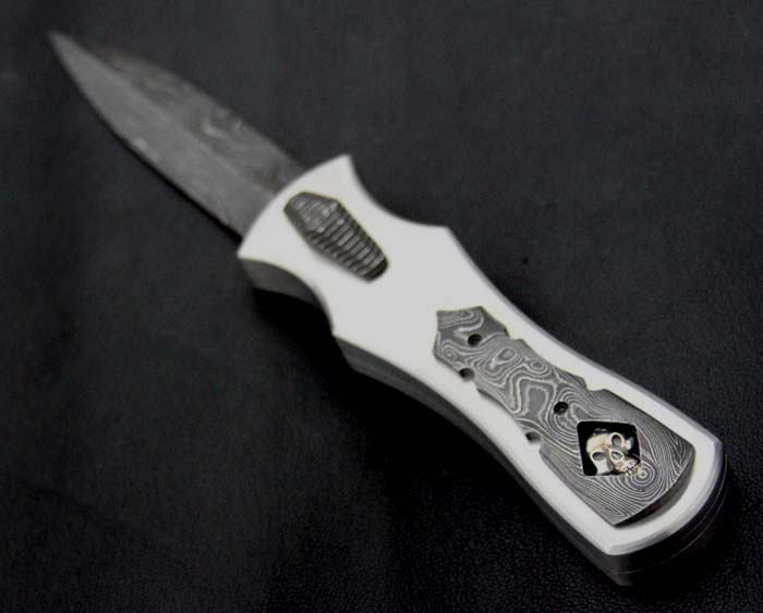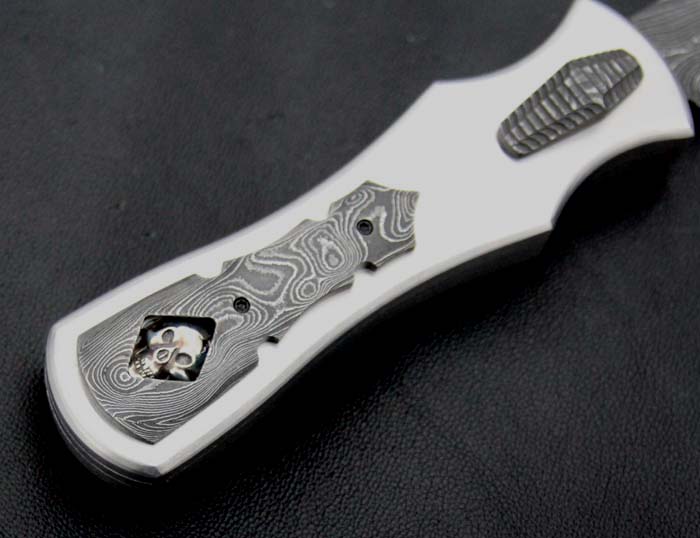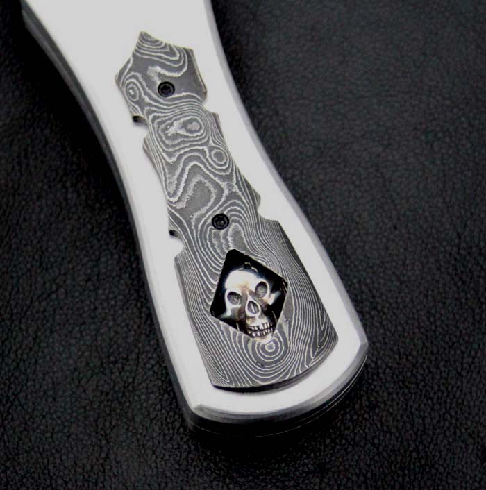 Custom Palm Viper DA OTF, "Skull of Diamonds." Stainless steel chassis with hand rubbed satin finish. Damascus coffin button and hollow ground Damascus dagger blade with choils. Chassis has Damascus overlays with sterling silver bullet-hole SKULL inlayed into the SS chassis looking out of the Diamond cut shape in the overlay. Skull logo engraved on backside of chassis. One of a kind custom. Pure sinister!